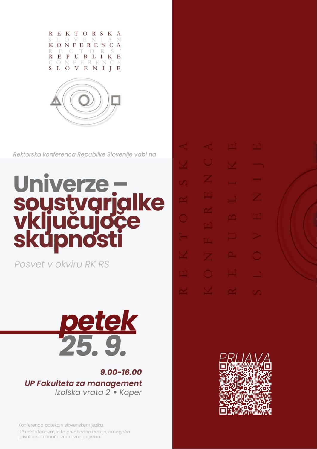 Program dogodka je dostopen TUKAJ. Dogodek bo potekal v slovenskem jeziku. Univerza na Primorskem bo udeležencem, ki bodo predhodno izrazili potrebo, omogočila prisotnost tolmača znakovnega jezika.